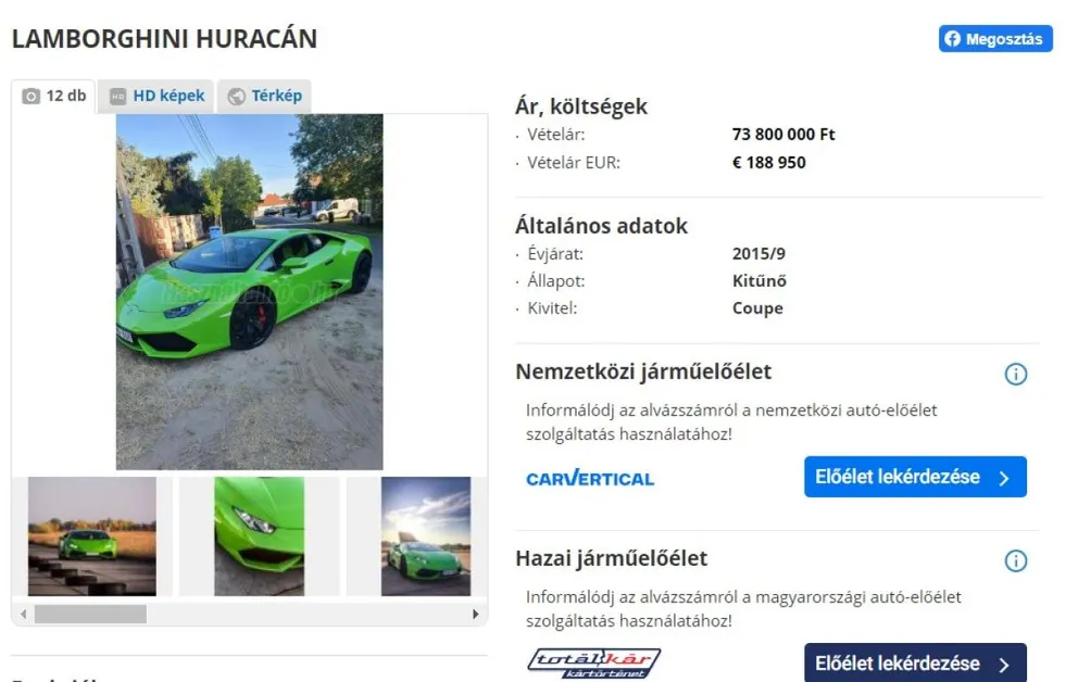 A kocsiról a rövid videón kívül más részletet Laci nem osztott meg, de lapunk munkatársának megakadt a szeme egy hirdetésen, amelyik kísértetiesen olyan autóról szól, amilyet a híresség beszerzett. Az adatok és a küllem is egyezik, ennek alapján pedig feltételezhetjük, hogy Gáspár Laci új kocsija az a Lamborghini, amelyiket a hasznaltauto.hu oldalon árultak 73.800.000 forintért. A leírás szerint egy teljesen újszerű kocsiról van szó, 2015-ben gyártották, 59.500 kilométer van benne, és fűtött garázsban tárolták.
