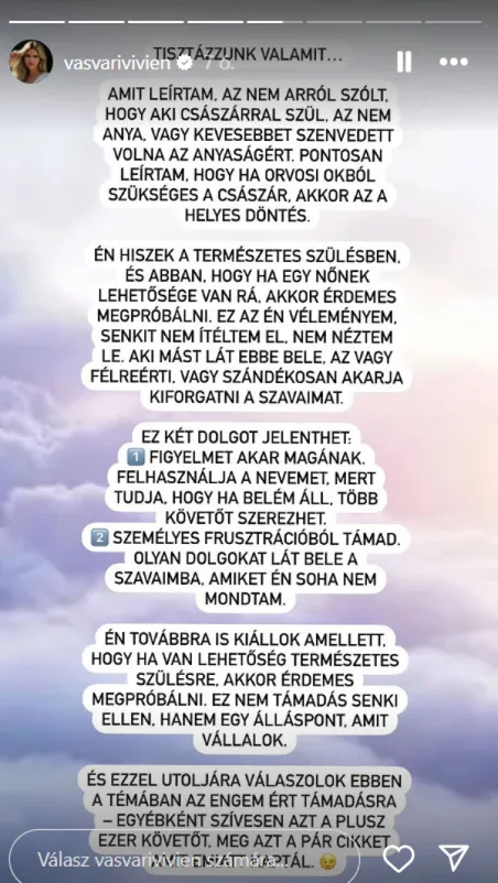 Én hiszek a természetes szülésben, és abban, hogy ha egy nőnek lehetősége van rá, akkor érdemes megpróbálni. Ez az én véleményem, senkit nem ítéltem el, senkit nem néztem le. Én továbbra is kiállok amellett: ha van lehetőség természetes szülésre, akkor érdemes megpróbálni. Ez nem támadás senki ellen, hanem egy álláspont, amit vállalok