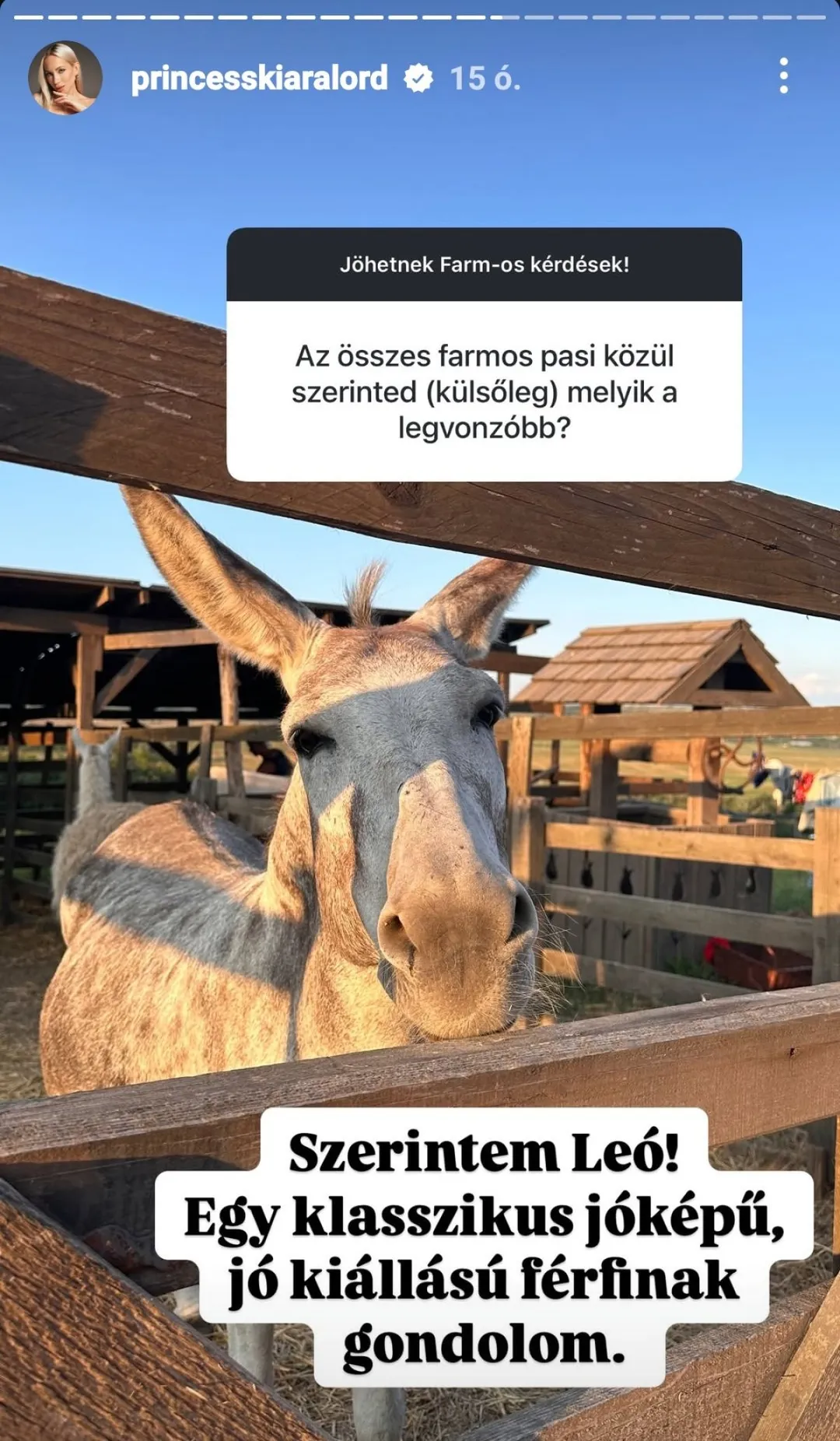 Kiara Lord Instagram-oldalán valaki megkérdezte azt is, hogy ki a legvonzóbb pasi a Farmon. Kiara hezitálás nélkül megírta, hogy szerinte Leo.