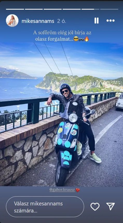 Ahogy arról korábban lapunk is beszámolt, Mikes Anna és Krausz Gábor a húsvéti ünnepek alkalmából a festői Olaszországba repült el kikapcsolódni, édes kettesben. Mind a sztárséf, mind a táncosnő örömmel osztott meg fotókat a közösségi oldalán arról, mennyire gyönyörű helyszínen élvezik a szabadságukat, vagy éppen milyen programokkal töltik a szabadidejüket. A minap Mikes Anna például azt mutatta meg, amint Krausz Gábor Olaszországban is nagy vagányan motorra pattant.