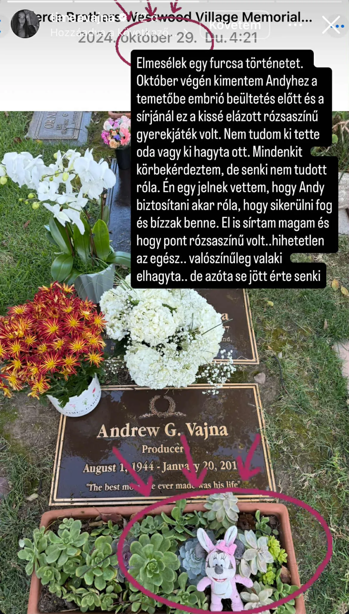 Nemcsak a látogatásról posztolt az üzletasszony, hanem megosztott egy megható történetet is. A közösségi oldalon egy rejtélyes, rózsaszín játékról is mesélt, amelyet tavaly a sírkő mellett talált.