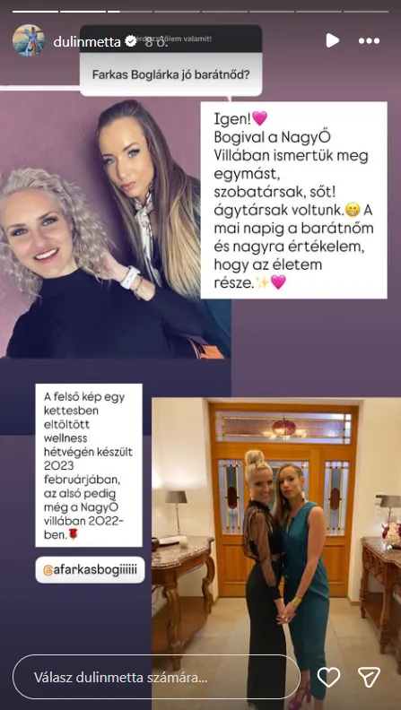 Farkas Boglárka jó barátnőm. A Nagy Ő villájában ismertük meg egymást, szobatársak, sőt, ágytársak voltunk! A mai napig a barátnőm és nagyra értékelem, hogy az életem része