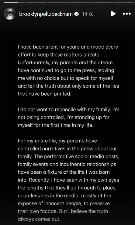Brooklyn Beckham egy éles hangvételű beszámolót osztott meg Instagramon, amiben minden őt ért sérelemről kitálalt a szüleivel, David és Victoria Beckhammel kapcsolatban. A sztárszülők gyermekét az utóbbi időben rengeteg kritika érte, amikor kiderült: letiltotta az anyját és az apját a közösségi médiában. Emellett sem az édesapja születésnapján nem jelent meg, sem a karácsonyt nem a családjával töltötte.