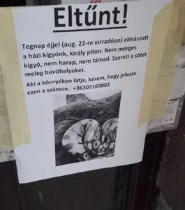 Nagy ijedelmet okozott Óbudán, hogy eltűnt kedvencét keresi egy kétségbeesett gazdi – ám a keresett kisállat ezúttal nem egy kutya vagy egy cica, hanem egy királypiton. A kis kedvenc csütörtökre virradóra mászott el otthonról.