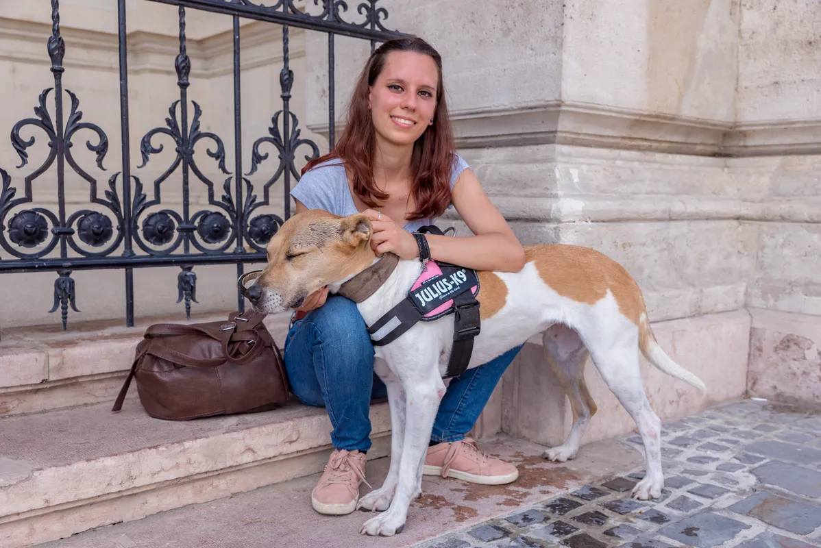A budapesti Aranyosi Réka a kutyájával, Csimpával sétált az Ízek utcájában. „Csimpa egy mentett kutya, félénk, itt lehetősége van szokni az embereket és én is szétnéztem, milyen magyar ételkülönlegességeket kínálnak„-mondta Réka.