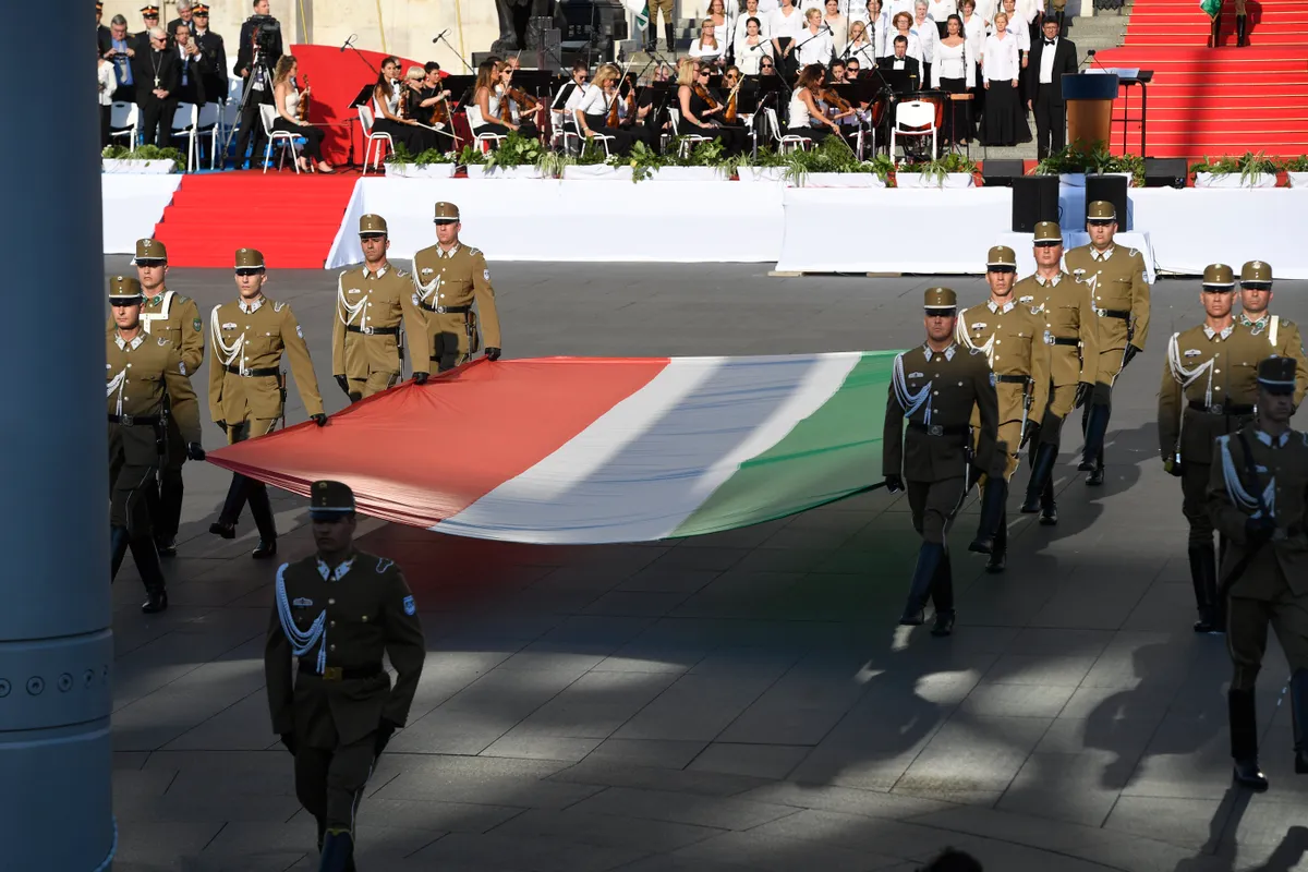 Megkezdődött az államalapítási ünnepség első igazán látványos eseménye, hatalmas nemzeti trikolórt húztak fel a fővárosi Kossuth téren a Himnusz hangjaira. A ceremónián Áder János államfő és Benkő Tibor honvédelmi miniszter is részt vett, de rengeteg nézelődő is végig kísérte a lobogó felvonását.