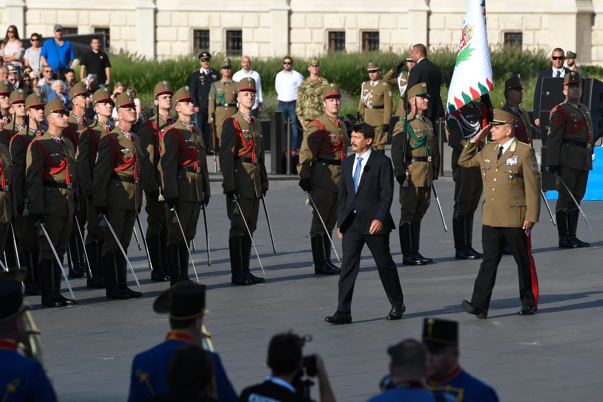 Katonai tiszteletadás mellett, Áder János államfő jelenlétében felvonták Magyarország nemzeti lobogóját az augusztus 20-ai állami ünnepen, kedd reggel Budapesten, a Parlament előtti Kossuth Lajos téren – adta hírül az MTI.