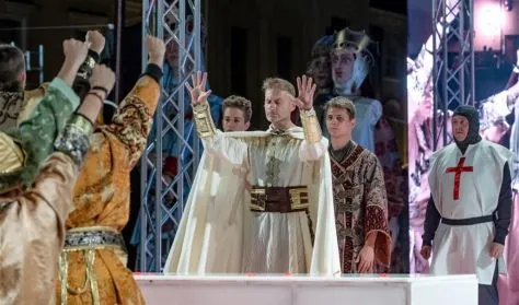 Hetedik alkalommal mutatják be a Koronázási Szertartásjátékot Székesfehérváron, a Nemzeti Emlékhelyen felépített szabadtéri színpadon. A produkciósorozat szombattól hétfőig látható.