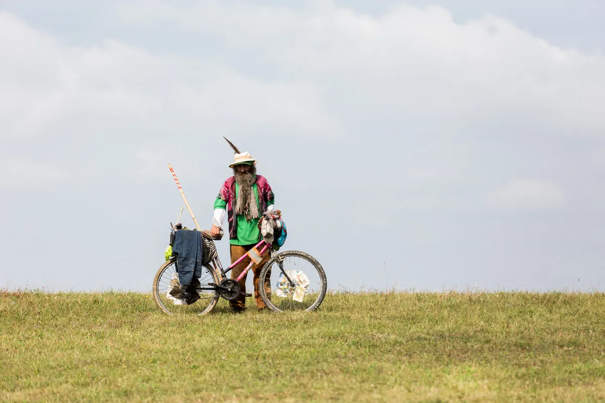 – Látom, szakadt a nadrágja, jöjjön, adok magának egy rendes farmert – kínálja a portékáját Varga Imre. A vándorcigánynál több eladó holmi van, felsorolja a választékot és már tartja is a kezét a pénznek. – Valamiből fedezni kell a költségeket – magyarázza mosolyogva. –Mindenhol eladok valamit, így mindig van miből élni, s menni tovább – teszi hozzá és mutatja a bicikli kerekén a képeslapokat azokról a helyekről, ahol már megfordult. A világjáró biciklijének két rendszáma is van. Kiderítettük: az egyik egy ideiglenes osztrák, a magyar rendszám pedig egy 15 éve forgalmon kívüli Wartburghoz tartozik. A várpalotai férfinak saját bevallása szerint 40 unokája és 10 asszonya van, akik közül kettőt a csatkai búcsúban ismert meg…