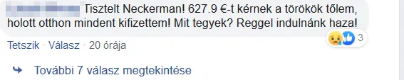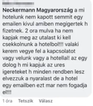 Egy Mexikóban tartózkodó magyar nő pedig hiába írt a Neckermann Facebook-oldalára, utolsó posztját rövid időn belül törölték. Ebben arra panaszkodik, hogy csak üres ígéreteket kapott eddig, és ha nem történik semmi és a hotel nem jut a pénzhez, 2 órájuk van elhagyni a szállást.