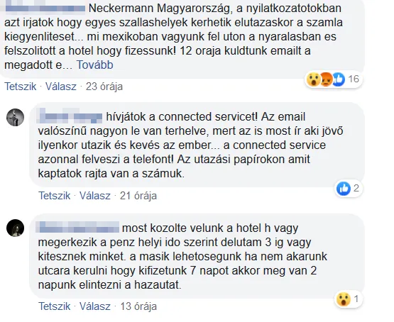 Van, aki arról panaszkodik, hogy az utazási irodánál senki nem veszi fel a telefont. Más azt írja: a sokadik negatív komment tűnik el az oldalról, amely arról szól, hogy a szállásdíjat újra ki kell fizetni külföldön. Többen mostanában indulnának Egyiptomba és más egzotikus célpontokra és aggódnak, hogy minden rendben lesz-e.