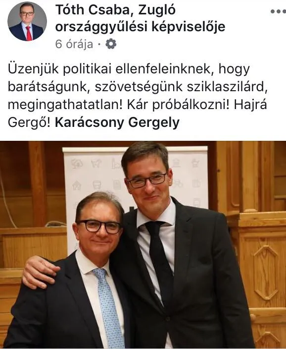 Tóth Csaba Karácsony őszödi beszédének kiszivárgását követően, szombat reggel egy közös képet rakott ki Karácsony Gergellyel, amelyhez az alábbi teljesen átlátszó, és a fenti előzmények után rendkívül nevetséges szöveget írta ki: