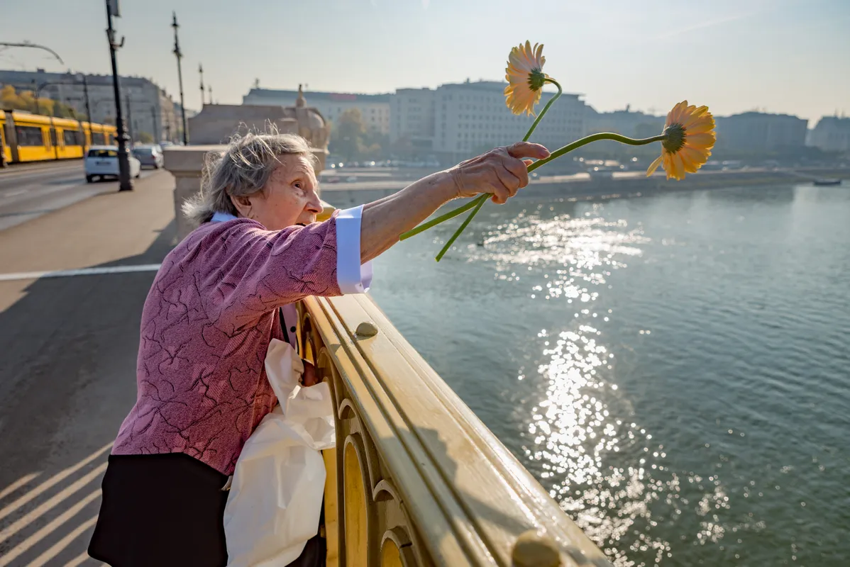 A Margit-hídon egy idős asszony le-le tekintett a mélybe, kezében két szál virágot tartott.