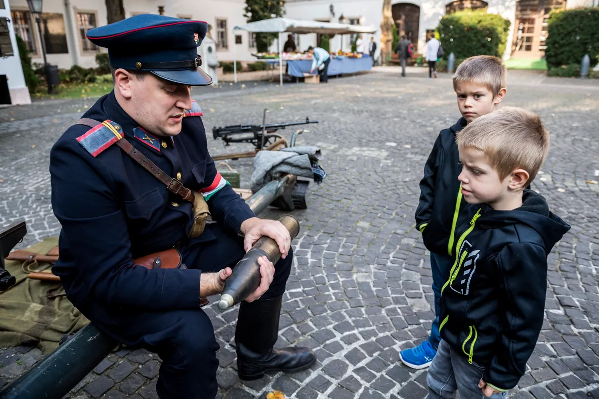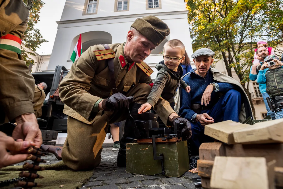 Korhű katonai ruhába öltözött hagyományőrzők tartanak fegyverbemutatót a Hadtörténeti Intézet és Múzeumban. Itt is családi napot tartanak az 1956-os forradalom és szabadságharc 63. évfordulóján.