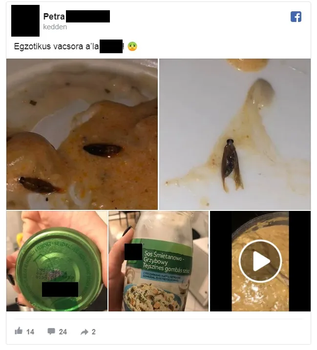 Az egyik budapesti Facebook csoportba töltötte fel a szószban talált rovarokról a képeket, amelyeket a gombás tésztaszószban talált. A vásárló leírása szerint már felvette a kapcsolatot a céggel e-mailben, de egyelőre nem kapott választ.