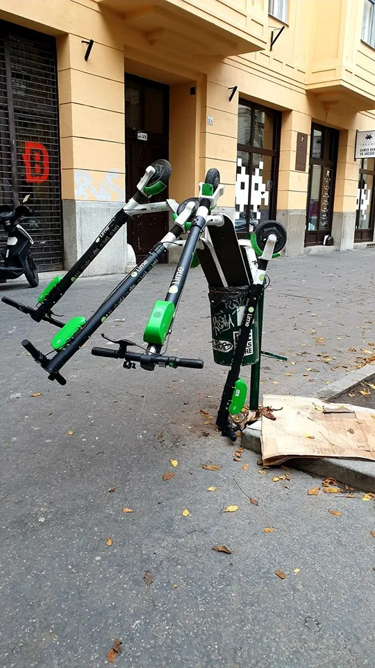 A dühöngő fővárosi gyalogosok a sokszor a járda közepén otthagyott, bérelhető elektromos rollerek miatt, hiába szerepel a bérbeadó cég szabályzatában, csak úgy lehet leparkolni a rollerekkel, hogy az másokat ne akadályozzon a közlekedésben.