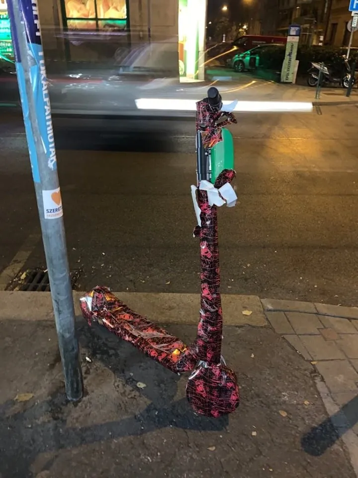Valaki megunhatta az e-rollerek kerülgetését és elkezdte becsomagolni a járgányokat. Budapesten a Wesselényi utca és a Rózsa utca sarkán a trolibusz megálló mellett hagytak ott egy becsomagolt rollert.