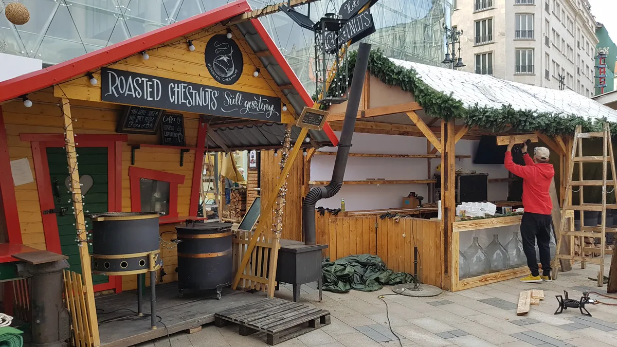 Szerdán – kihasználva, hogy nem esett az eső – gőzerővel dolgoztak a munkások a budapesti Vörösmarty téren, hogy gond nélkül megnyithasson pénteken a 2019-es Budapesti Adventi és Karácsonyi Vásár.