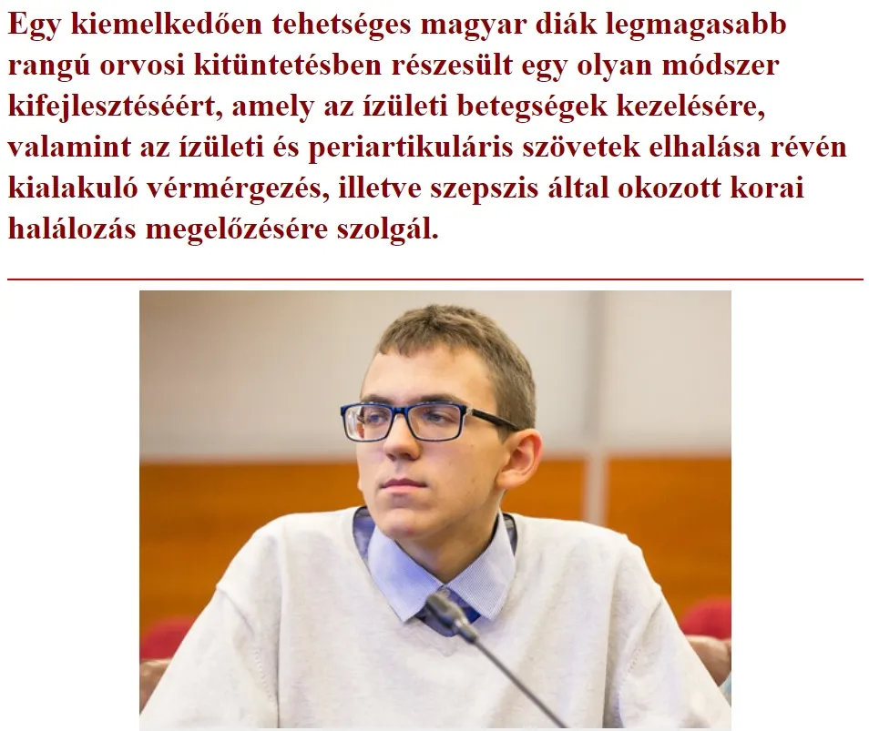 Ki ne lenne büszke egy 18 éves magyar fiúra, akit 10 perces tapssal fogadtak az őszi Közép-Európai Reumatológus Kongresszuson? Egy orvostanhallgatóra, akit édesanyja és nagymamája halála ösztönzött a kutatásra? Akinél külföldi gyógyszergyárak kopogtattak, hogy adja el nekik a titkos formuláját, de ő nem engedett a csábításnak? Akiről dr. Szemerey Ilona reumatológus, az Országos Reumatológiai és Fizioterápiás Intézet (ORFI) vezetője is csak elismeréssel beszélt, s találmányát az ORFI mellett az Egészségügyi Minisztérium is támogatja? Ráadásul a különleges készítmény, amelyet betegek sora dicsér, most fél áron elérhető! Kár, hogy az egészből csak a fizetendő 9990 forint igaz…