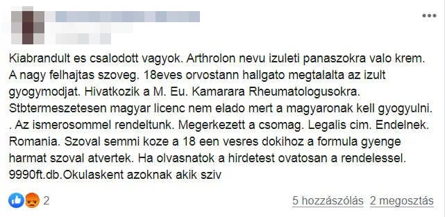 „Kiábrándult és csalódott vagyok. Az ok az Arthrolon nevű, ízületi panaszokra való krém. A szöveg szerint egy 18 éves orvostanhallgató megtalálta az ízületi problémák gyógymódját. Hivatkozik a Magyar Egészségügyi Kamarára, reumatológusokra… Az ismerősömmel rendeltünk. Megérkezett a csomag. Legális cím, Románia, szóval semmi köze a 18 éves dokihoz, a formula gyenge harmat, szóval átvertek. Ha olvasnátok a hirdetést, óvatosan a rendeléssel (…)” – írja C. Jánosné a közösségi oldalán.