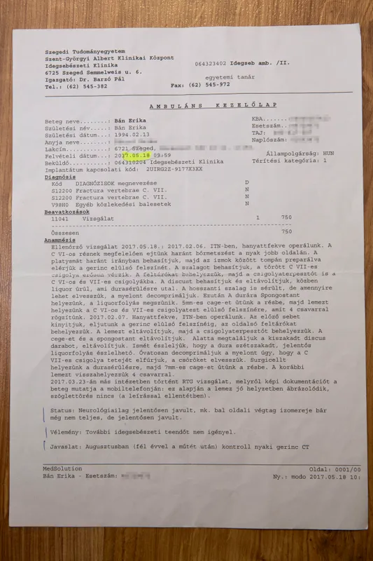 „Egy ismerőshöz autóztunk a barátaimmal, amikor a kocsi megcsúszott a jeges úton, és az árokban kötött ki. Mivel nem voltam bekötve, megsérültem, vákuum matracon szállítottak kórházba. Ott megröntgeneztek, és azt mondták, nincs törésem. Erre felültem, és valami reccsent a nyakamban. Úgy engedtek el a kórházból, hogy pihenjek sokat, igyak sok folyadékot, így folytattam tovább az életem. Egy hét múlva felfigyeltem rá, hogy zsibbad a bal kezem, ezért elmentem a városi rendelőbe kontrollra. Ott ismét megröntgeneztek, és azonnal kórházba küldtek. A felvétel egyértelműen kimutatta: a C6 és C7 nyaki csigolyáimnál törés van!”