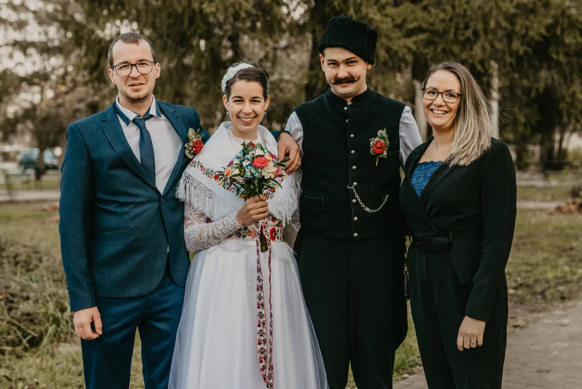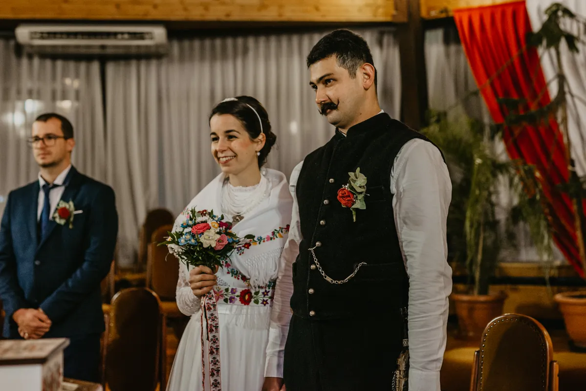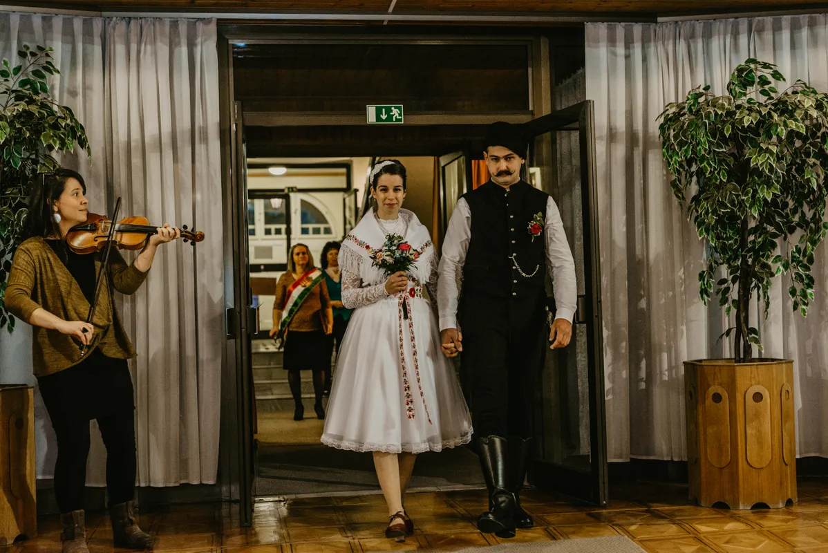 A fiatal pár a polgári szertartáson szűk családi körben mondta ki a boldogító igent. A zenét barátaik biztosították, s a végén Ádám is beállt közéjük brácsázni egy kicsit. A jövő nyárra hatalmas, több mint száz fős lakodalmat is terveznek: ugyanezekkel a ruhákkal, kiegészítőkkel, még több régi hagyománnyal.