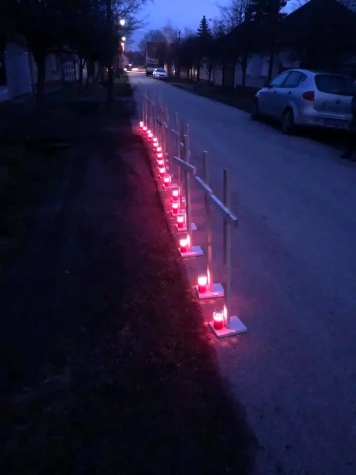 Sötétedéskor érkeztek Békéscsabára a veronai busztragédia áldozatainak családjai. Tizennyolc keresztet állítottak, tizennyolc mécsessel a buszsofőr, V. János háza előtt december 25-én.
