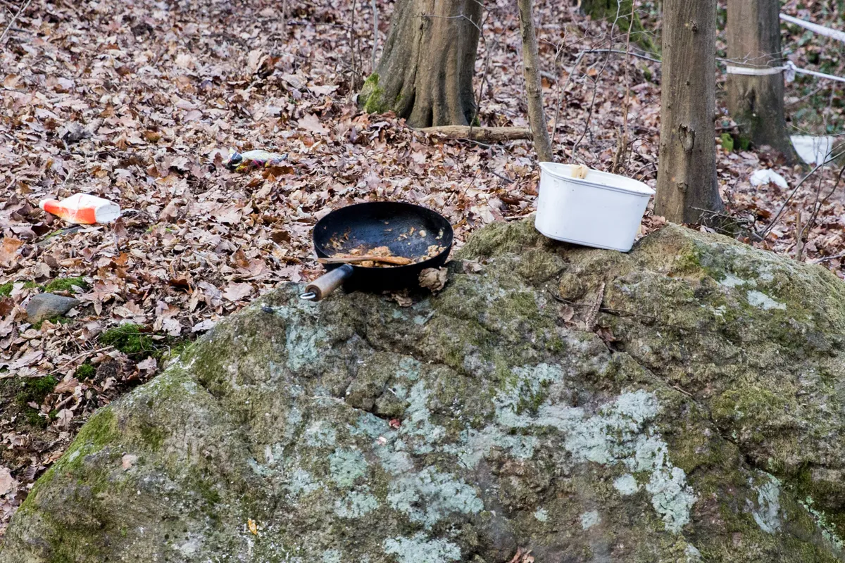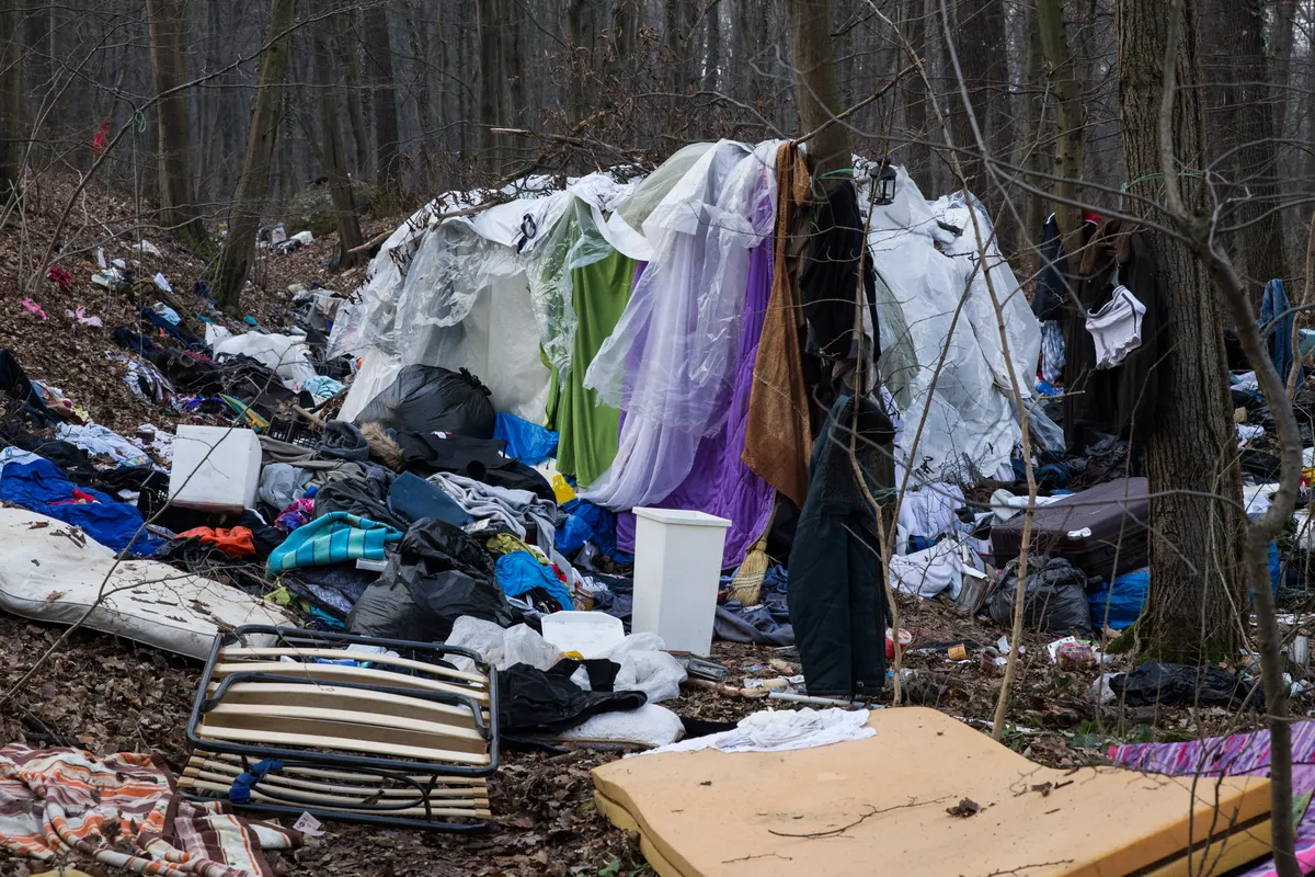 Az erdőben, az erdei tornapályától mindössze 50 méterre egy sekélyebb, több méter hosszú árokban alakították ki táborukat a hajléktalanok, hatalmas szemétkupacokat hagyva maguk után a természetvédelmei övezet határán. Munkatársaink nem találtak embereket napközben a táborban, csak az életvitelszerű tartózkodás nyomait – ott, ahol sem egy mosdó, sem egy szeméttároló, sem tisztálkodási lehetőség, semmi nincs.
