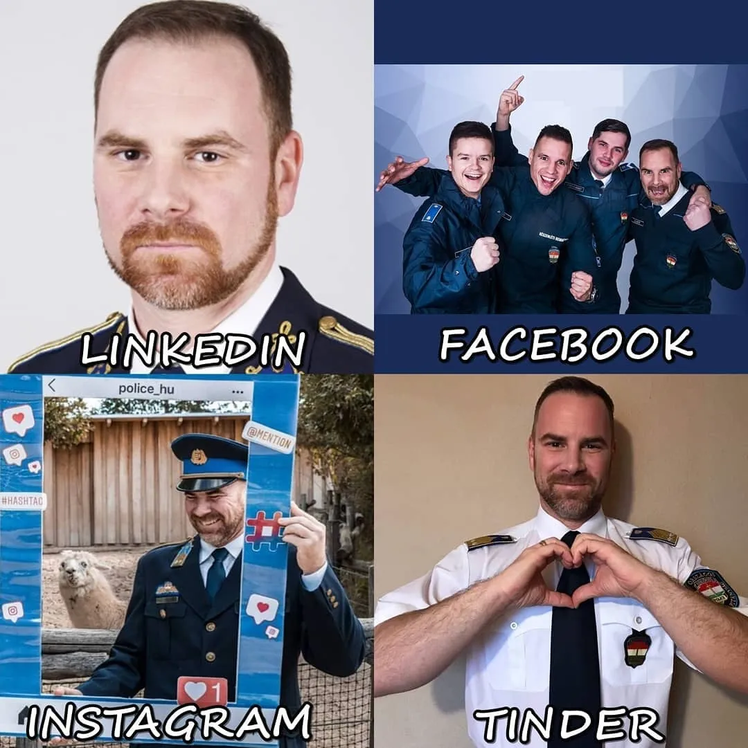 Ellepték a közösségi oldalakat azok a fotómontázsok, melyeken négy fénykép szerepel LinkedIn, Instagram, Facebook és Tinder feliratokkal. Bár sokan elsőre nem értik, miről van szó, a magyarázat egyszerű: mindenki más arcát mutatja a legnépszerűbb internetes oldalakon, attól függően, hogy komoly, szakmai oldalról, barátokról, ismerősökről szóló közösségi oldalról, követőknek címzett netes felületről vagy társkereső alkalmazásról van szó. A legnagyobb eltérés természetesen a LinkedIn és a Tinder között látható, hiszen előbbire az üzleti kosztümös, öltönyös fotók kerülnek fel, míg utóbbira a szexibb képek, így leginkább ezekben a különbségekben van a poén.