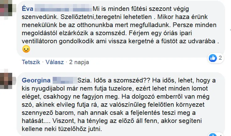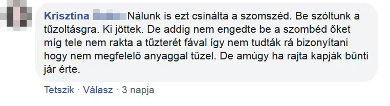„A XXII. kerületben élek, minden tél maga a pokol, amikor a szomszéd begyújt. Fogalmam sincs, mit égethet, de hiába van csukva minden ablak, ha olyan a szélirány, bejön a lakásba is a füst, ami a szemünket is csípte. Szóltunk neki, de csak megvonta a vállát és közölte, hogy ez olcsóbb, mint a gáz„ – mondta István, aki kérte, hogy ne írjuk le a teljes nevét.