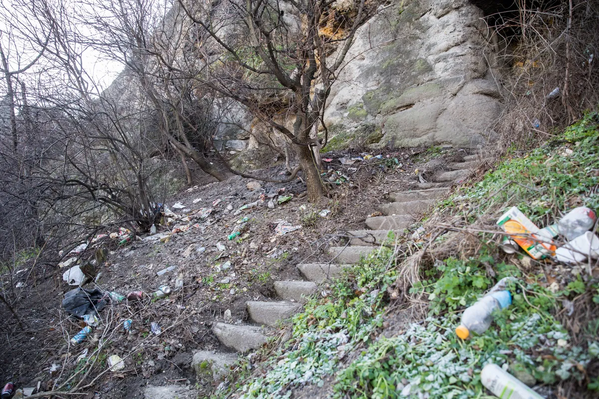 Mindez már a Szent Gellért rakparton járó villamosokból is jól látszik: a hegy tetején lévő barlangokból folyik lefelé a hegy oldalán a háztartási szemét.