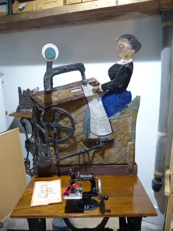 A gyűjtő Németországból szerezte be a ezt a céllövölde automatát. Egy nő ül a varrógép mellett. Ha eltalálják a korongot, a hölgy elkezd varrni. Jelenleg a budaörsi kiállításon nézhető meg, labdával lehet dobni rá.