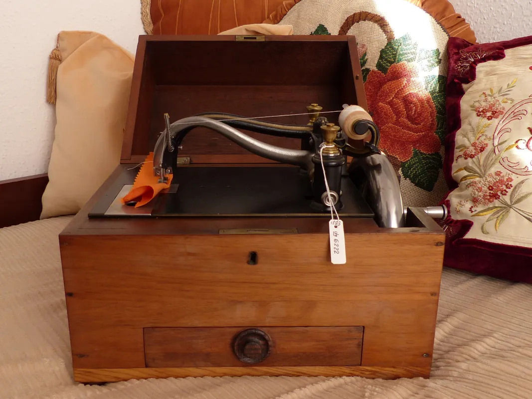 A gyűjteményben található legöregebb darab, 1857-ből. Ez volt a legelső táska varrógép. Grover & Baker, fantázianeve: Portable.