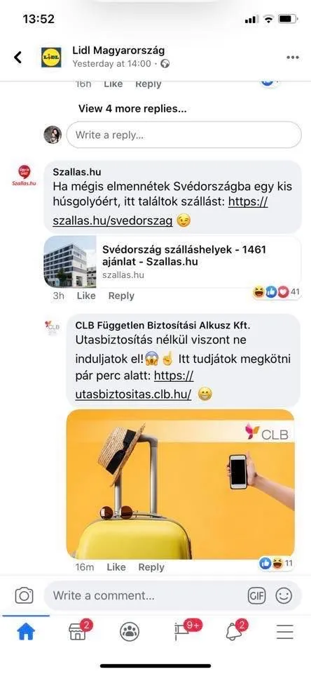A Lidl szerint ugyanis az autentikus húsgolyókért nem kell Svédországig utazni. Ezzel a húsgolyóiról (is) híres IKEA is egyetértett, de megjelent a Szállás.hu, amely az utazás mellett döntőknek javasolt a Lidl posztja alatt szállást, végül pedig egy utasbiztosítással foglalkozó cég is beszállt: