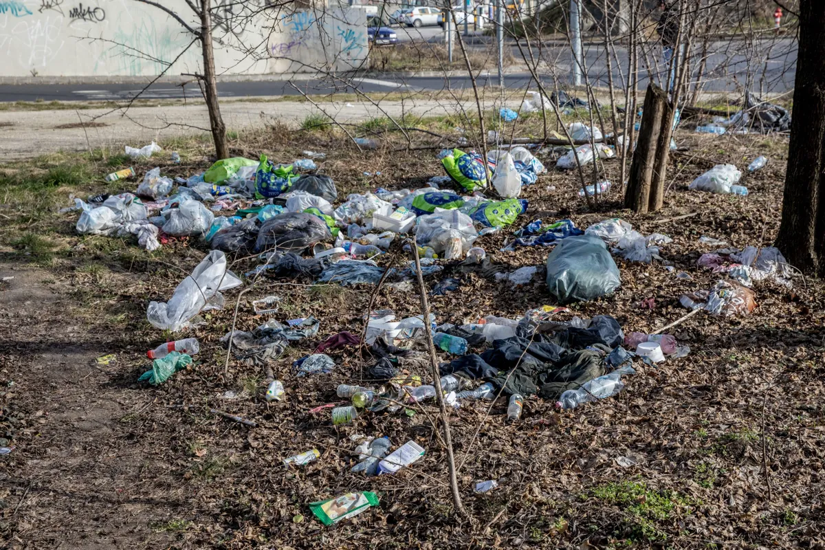 A kiserdő szélén háztartási szeméttel van tele a zöldterület. De nemcsak szétszórt szemetet láttunk itt, hanem egyforma méretű lejárt zacskókat is. Mintha valaki összegyűjtötte volna a hulladékot, majd itt szabadult meg tőle.
