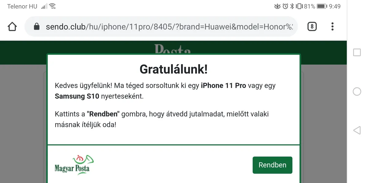 Csakhogy ezek a nagy cégek nem így hirdetik a nyereményjátékaikat. A Magyar Posta biztonsági felhívást is közzétett az oldalán: az értékes nyereményeket, számos esetben mobiltelefont ígérő „nyereményjátékot” nem ők hirdették meg.