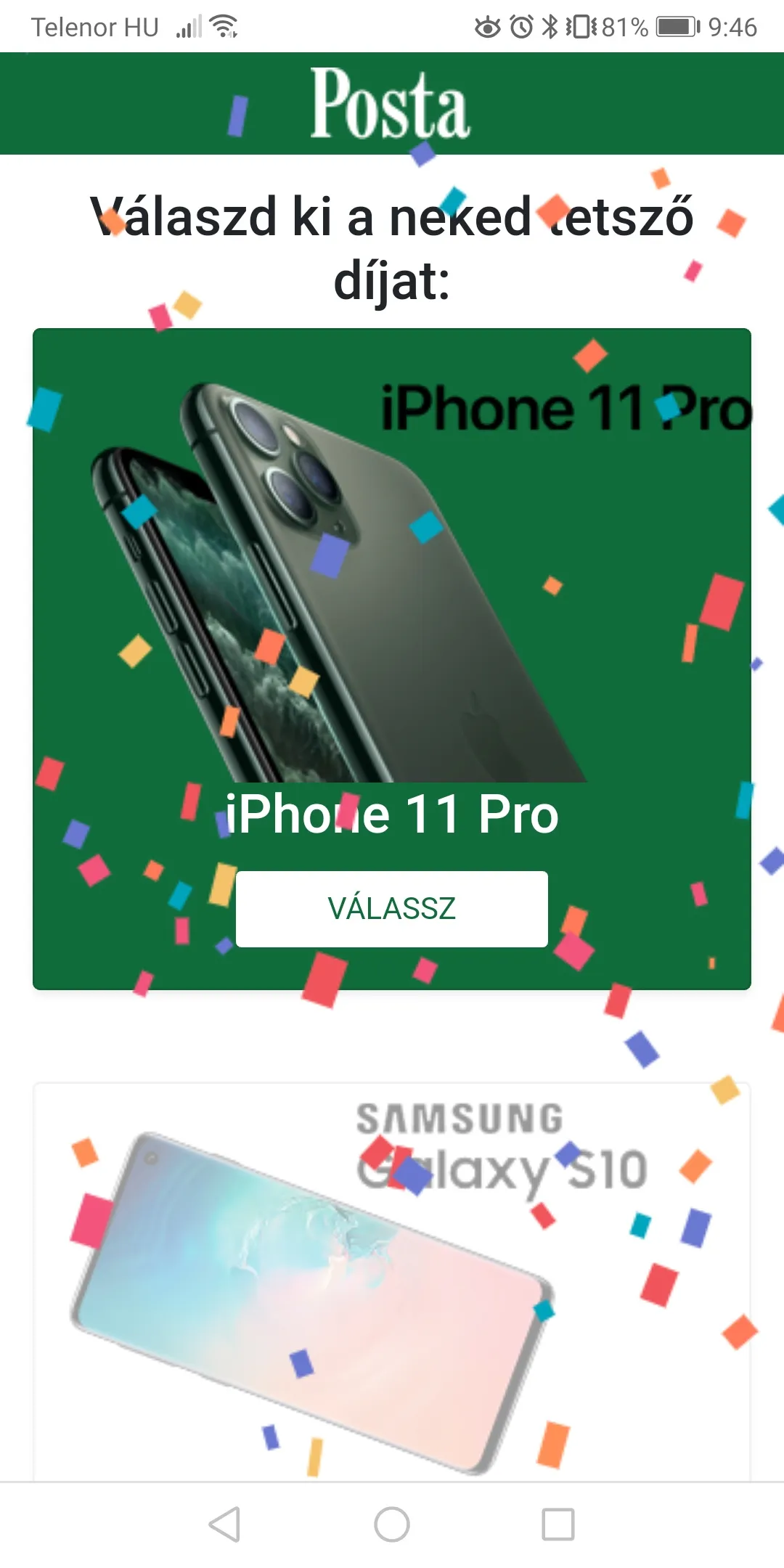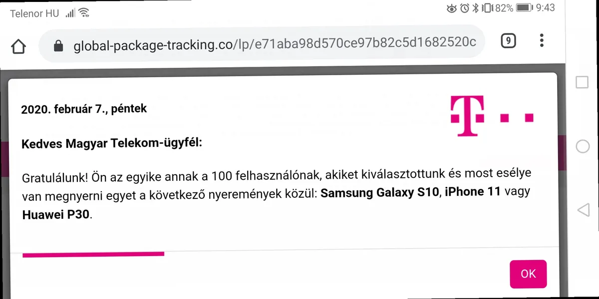 Újabb módszerrel próbálkoznak a csalók. A Magyar Posta, a Google és a Telekom nevében jelennek meg játékok a telefonon. A felugró ablak értékes nyereményeket, többnyire telefonokat ígér.