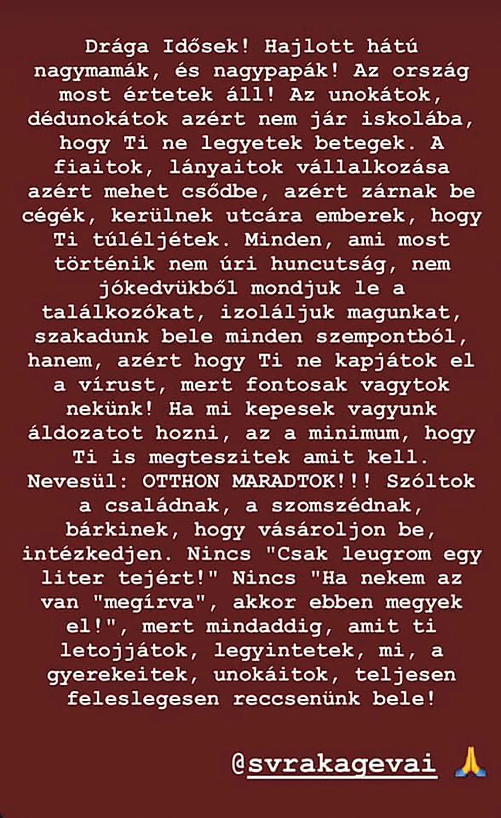Az interneten keringő levélben, amit már több ezren megosztottak, erre akarja felhívni a figyelmet a szerző. A levelet közreadva, nagy tisztelettel, szeretettel és féltéssel kérjük szüleinket, nagyszüleinket: maradjanak otthon, engedjék meg, hogy most mások gondoskodjanak róluk!