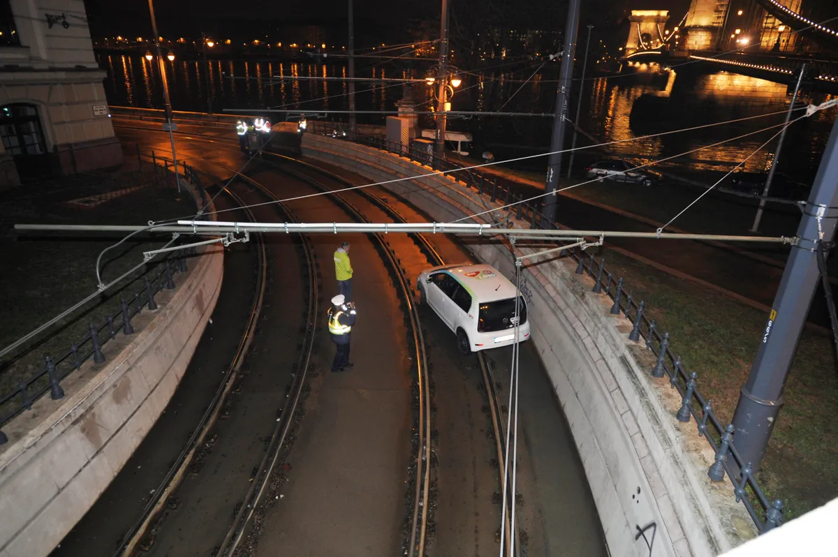 Bizonyára jó ötletnek gondolta a Mol Limo autómegosztó flottájába tartó kiskocsit vezető sofőr, hogy majd egy villamos elvezeti őt úti céljához. Azt azonban nem gondolhatta végig, hogy a villamos útjába esik a Lánchídnál egy alagút is, ahol a kis VW már nem tudta átverekedni magát és a síneken ragadt.