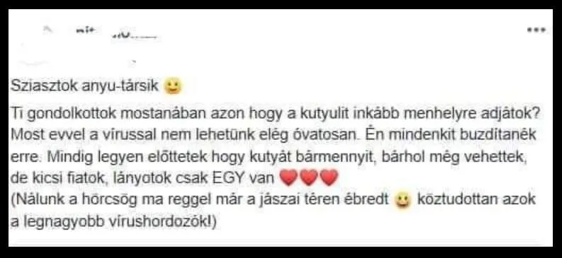 Egy anyuka nagy felháborodást kiváltót posztolt a Facebookon: azt írta, hogy kirakta az utcára a hörcsögét, mert „elővigyázatosnak” kell lenni a vírus miatt. Ráadásul mindenkit arra buzdít, hogy „adják be menhelyre a kutyáikat, hiszen állatot bármikor lehet venni” – nem csoda, hogy a posztja nagy vihart kavart.