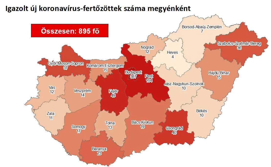 Újabb magyar állampolgároknál mutatták ki az új koronavírus-fertőzést (COVID-19), ezzel 895 főre nőtt a hazánkban beazonosított fertőzöttek száma. Az elhunyt, idős betegek száma 58-ra nőtt. A gyógyultak száma 94 fő. Hatósági házi karanténban 15481 ember van.