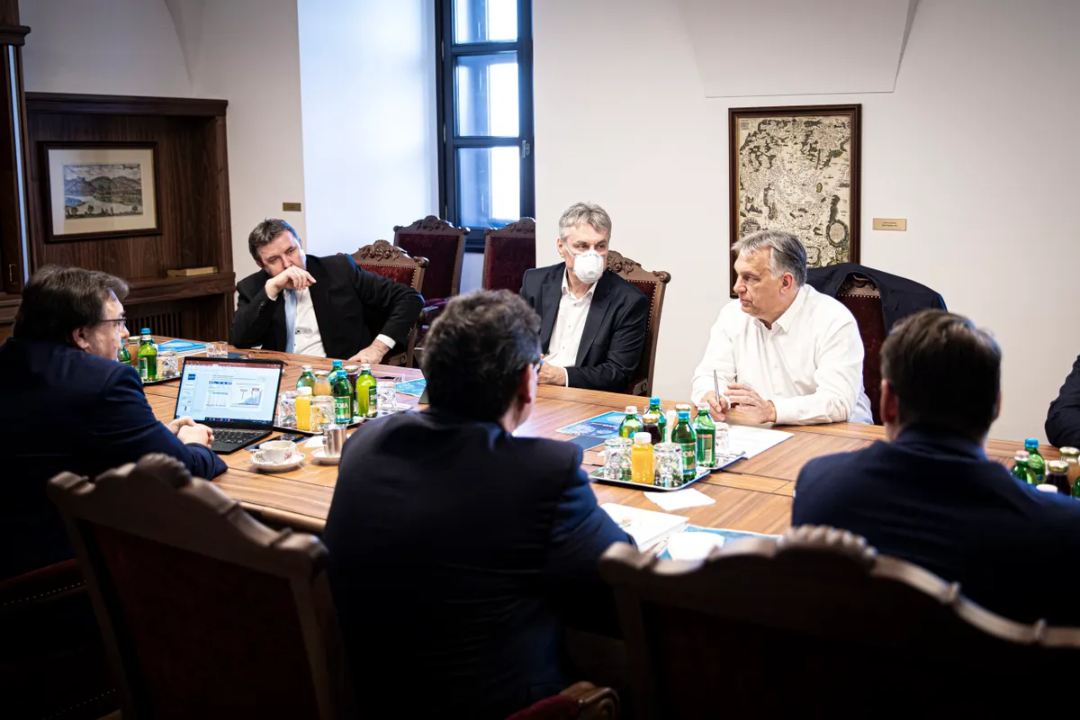 A Miniszterelnöki Sajtóiroda által közreadott képen Orbán Viktor miniszterelnök (k) virológusokkal egyeztet a Karmelita kolostorban 2020. április 9-én. A kormányfõ mellett Palkovics László innovációs és technológiai miniszter (bal szélen).
