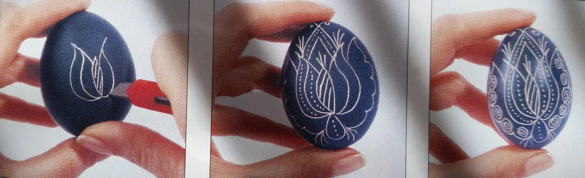 A tojásdíszítéshez nem kell más, csak tojás és olyasmi, ami minden háztartásban fellelhető. A tojást színezhetjük hagymahéj levében áztatva, és díszíthetjük karcolt technikával. Ehhez a legjobb a tapétavágó, de ha nincs, jó a hegyes kés, bármilyen penge hegye.