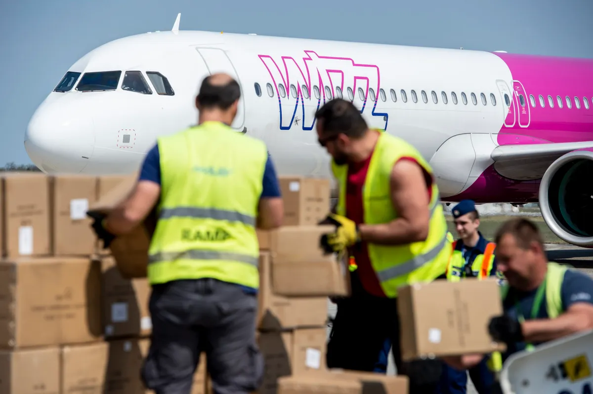 A kormany.hu által közreadott képen Kínából érkezett újabb egészségügyi védõfelszerelés-szállítmányt pakolják ki a Liszt Ferenc-repülõtéren