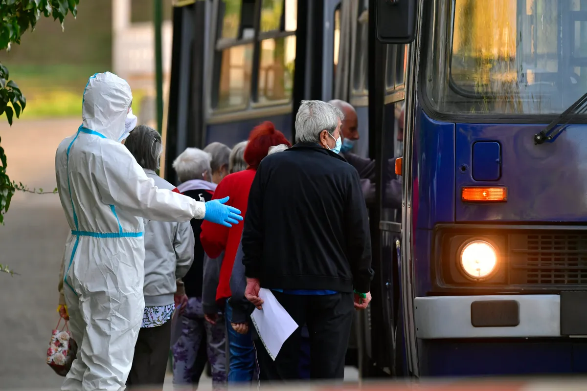Lakókat visznek a Pesti úti idõsotthonból 2020. április 9-én. Az intézményben több mint százan megfertõzõdtek, közülük öten meghaltak.