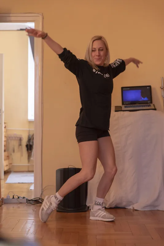 Melinda a bemelegítést sem hagyja ki, mindent ugyanúgy oktat, mint élőben, egy különbséggel: teljesen tükrözve kell mondania mindent.