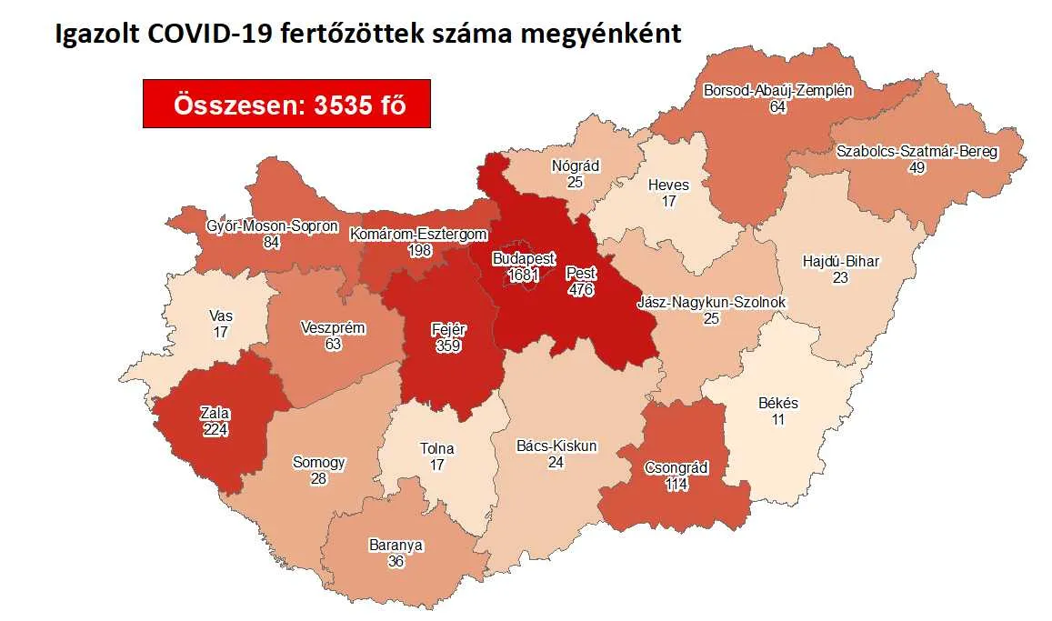 Újabb 26 magyar állampolgárnál mutatták ki az új koronavírus-fertőzést (COVID-19), ezzel 3535 főre nőtt a hazánkban beazonosított fertőzöttek száma. Elhunyt újabb 11 idős krónikus beteg. Ezzel 462 főre emelkedett az elhunytak száma, 1400-an pedig már gyógyultan távoztak a kórházból. Az aktív fertőzöttek száma 1673 fő, harmaduk (568 fő) kórházi ellátásra szorul, közülük 46-an vannak lélegeztetőgépen.