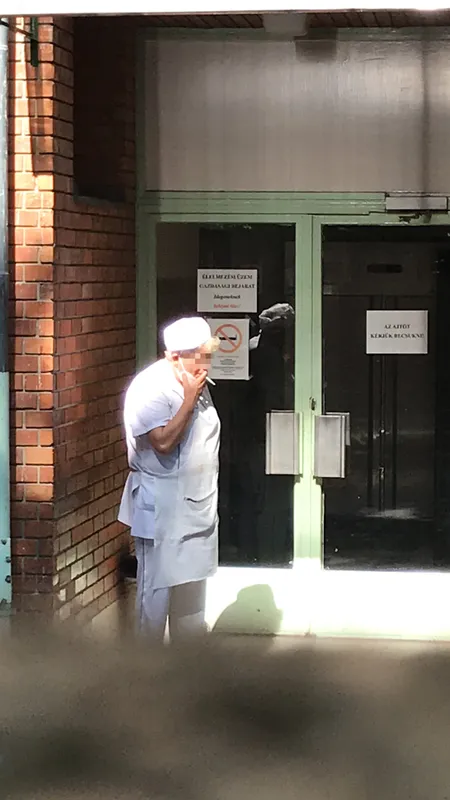 A Ripost fotósa kapta lencsevégre a Pesti úti otthon dolgozóit, amint szívják a cigarettát mindenhol: a hordágyon szállított beteg és még a tiltó tábla mellett is.