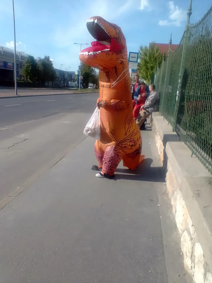 Budapesten, az Újbuda centernél, egy buszmegállóban kapták lencsevégre a dinó jelmezbe öltözött embert.