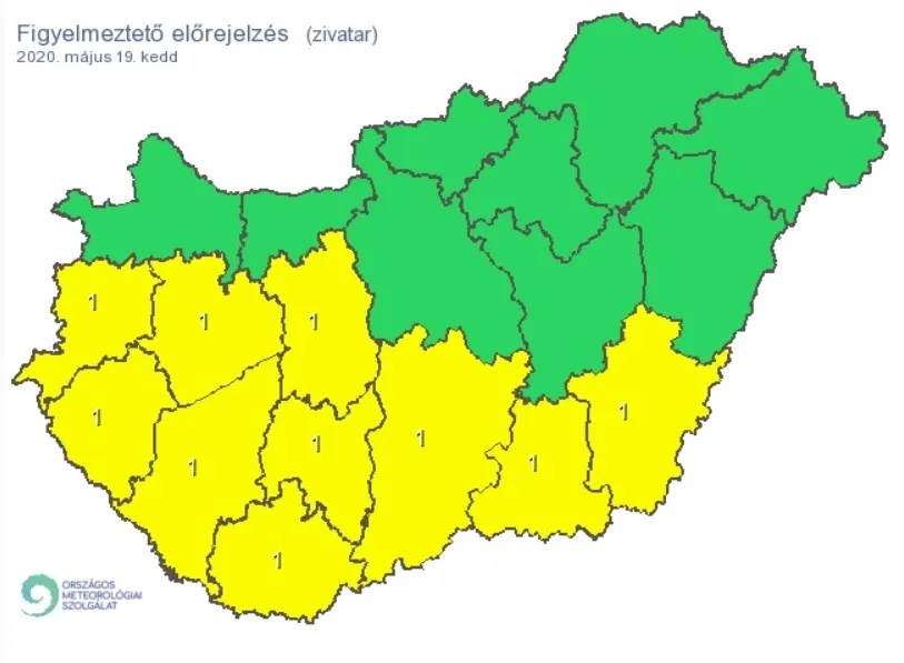 A figyelmeztető előrejelzést Magyarország területére 2020.05.19. kedd éjfélig léptették érvénybe. A Dunántúlon és délen alakulhatnak ki záporok mellett helyenként zivatarok, melyeket szélerősödés (50-60 km/h), és nagyobb mennyiségű csapadék (lokálisan akár 15-20 mm) kísérhet.